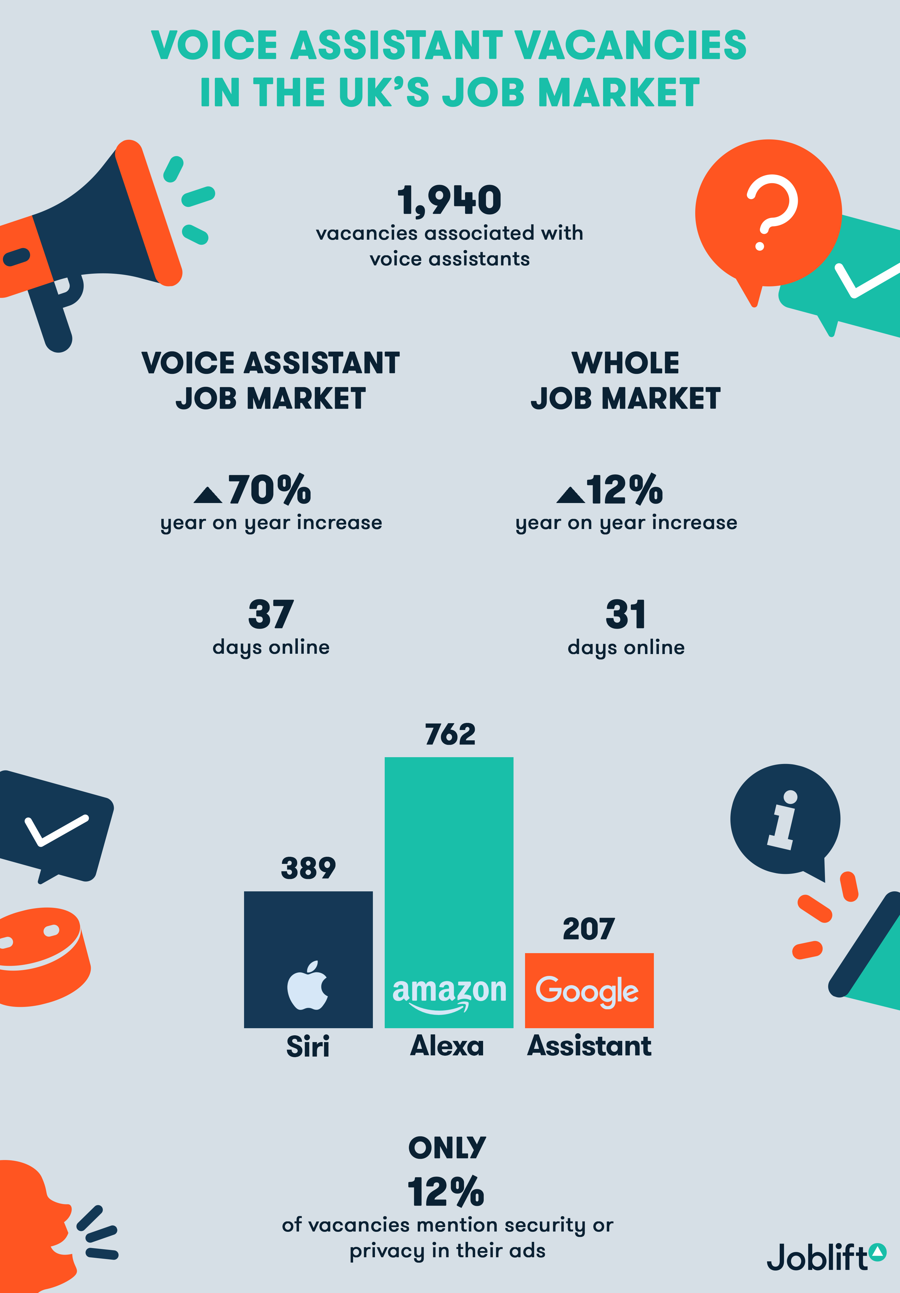 London, 19th June 2018 – From mysterious laughter in the middle of the night, to recording and sending out users’ private conversations, voice assistants – such as Amazon’s Alexa – have been the subject of contentious debate in the United Kingdom recently. The use of voice-enabled smart devices has become an everyday part of life for huge numbers of UK consumers but concerns around privacy are ever-present. With this in mind, job search platform Joblift has analysed the voice assistant job market in the UK, looking into the top professions and most active employers, as well as noting the lack of emphasis given to security and privacy in job postings.